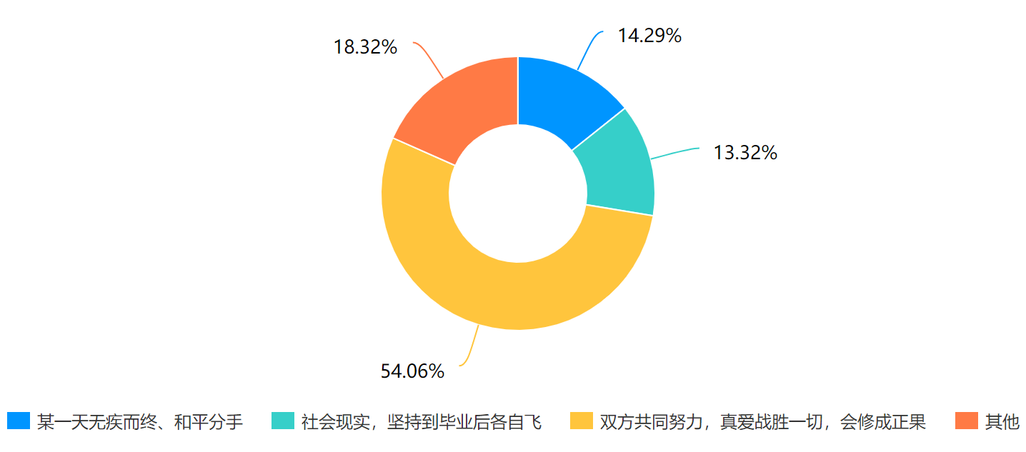 在学生的恋爱心理方面,大部分学生(54.6%)对于校园恋爱保持着积极的态度,认为只要双方共同努力,真爱可以战胜一切困难,而认为校园爱情不切实际,最终都会以失败而告终的学生占比为27.6%,说明我校学生对于校园爱情有着自我的见解。