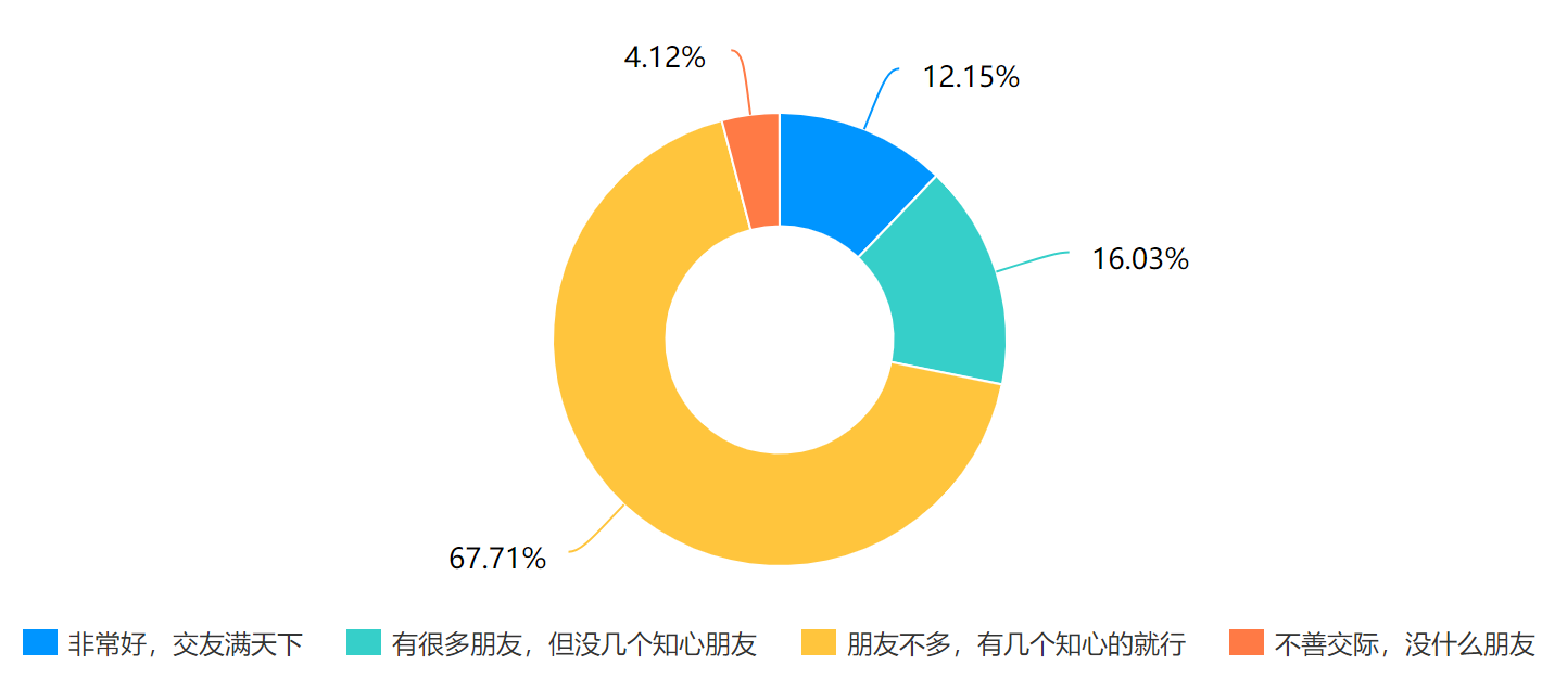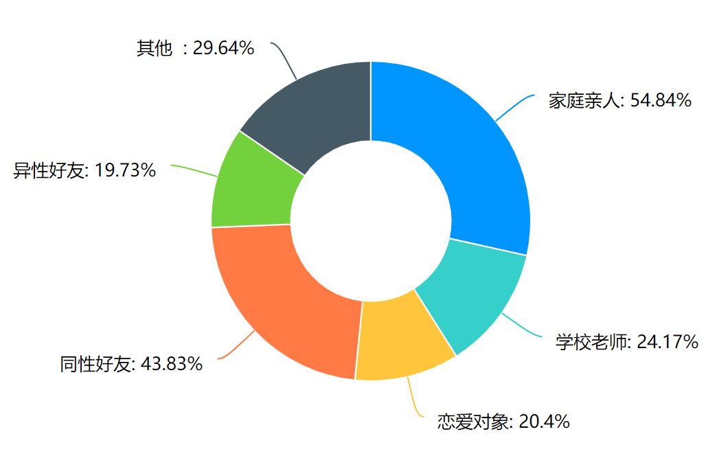 在社会支持系统方面,有很大一部分学生(73.65%)觉得自己偶尔会感到孤独,甚至还有一小部分学生(5.56%)觉得没有人能懂自己。在第11题“您认为自己缺乏关心/爱吗?”中,有39.75%的学生认为自己缺乏关爱,主要缺乏来自家庭亲人的关爱(54.84%),其次是同性好友(43.83%)、学校老师(24.17%)、恋爱对象(20.4%)、异性好友(19.73%),说明我校学生对亲情和友情的渴望程度比较强烈,也反映了学生缺乏来自家庭方面的社会支持。