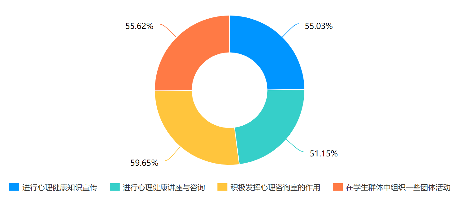在学校心理辅导工作的认识和看法中,有93%的同学表示没有接受过心理咨询或治疗,并表示不去心理咨询的主要原因是觉得自己能解决问题(53.97%),如果学生能够通过自身的力量去解决问题,这能够帮助学生得到成长,同时也不会过于依赖心理咨询师。在第35题“您认为大学生心理健康工作者目前应加强哪方面的工作?”中,认为需要积极发挥心理咨询室的作用(59.65%)位居第一,其次是在学生群体中组织一些团体活动(55.62%),进行心理健康知识宣传(55.03%)。心理健康服务的方式多种多样,但受目前我国的心理健康服务的主流影响,大部分学生只认识到咨询一种方式,咨询的特点限制了心理健康服务市场需求充分表露,因此应当推进心理健康服务形式多样化发展,满足大学生心理健康服务的需求,提高大学生心理健康水平和幸福感水平。