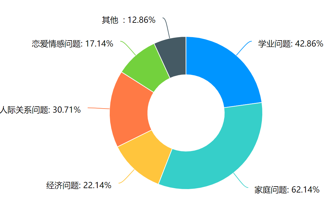 在情绪管理与压力应对方面,在过去的一个月中有65%的同学出现平静随和的情绪,45%的同学出现无聊枯燥的情绪。在调查学生“是否有过自杀念头?”时,有8%的同学表示出现过自杀的念头,出现这种想法的主要原因是家庭问题(62.14%),其次学业问题(42.86%)和人际关系问题(30.71%)等的多重压力。目前对于学生来说所面临最大的心理压力是“前途及就业问题”,而释放压力的途径主要通过和好友、家人倾诉或者听歌,睡觉等方式转移注意力,释放压力。