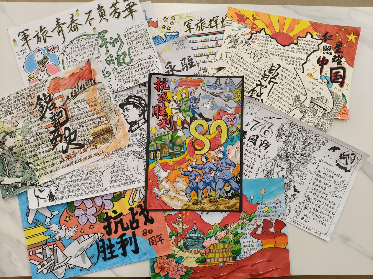 活动期间,同学们利用课余时间精心创作,将对家国的热爱融入每一处细节:一笔一画勾勒军装的飒爽,一涂一染晕开国旗的鲜红,一字一句书写英雄的壮举。这些作品主题鲜明、内容丰富、形式多样,既有对人民军队光辉历程的追溯,也有对当代军人风采的礼赞。墨香与色彩交织间,既展现了新生的创意巧思,更让军旅精神随画作流转,实现“创作+观赏”双向浸润。