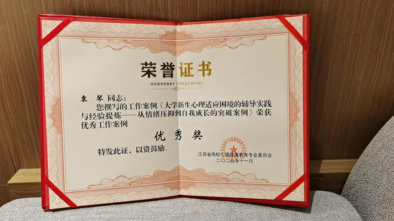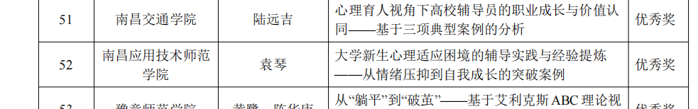 优秀工作案例奖:袁琴,《大学新生心理适应困境的辅导实践与经验提炼——从情绪压抑到自我成长的突破案例》。
