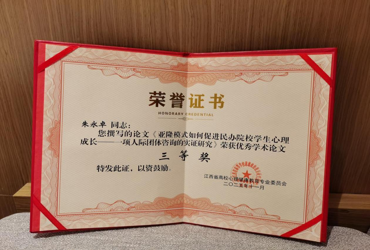 优秀学术论文奖:朱永卓《亚隆模式如何促进民办院校学生心理成长——一项人际团体咨询的实证研究》荣获三等奖。