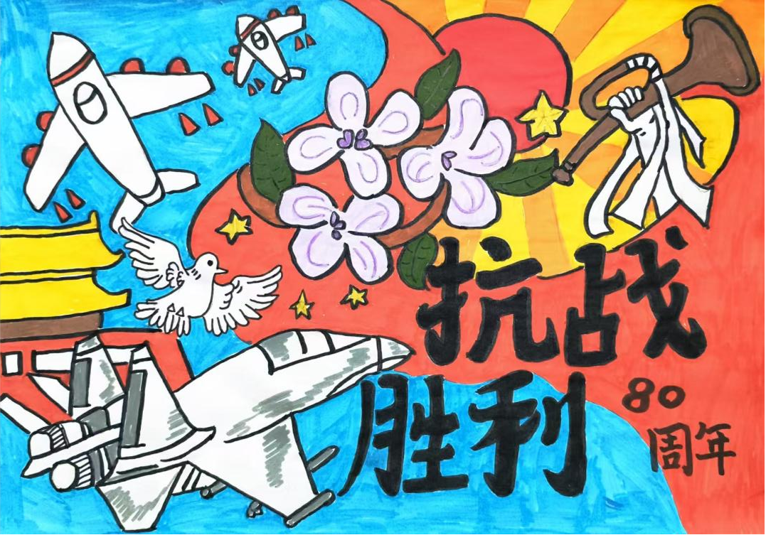 鲜艳的色彩碰撞,勾勒出抗战胜利的恢宏场景。画面中,战士们的坚毅神情与飘扬的旗帜交相辉映,“胜利”二字在斑斓的背景中格外醒目。创作者以充满张力的笔触,回溯人民军队在烽火岁月里的浴血荣光,每一抹色彩都是对英雄先辈的崇高敬意。
